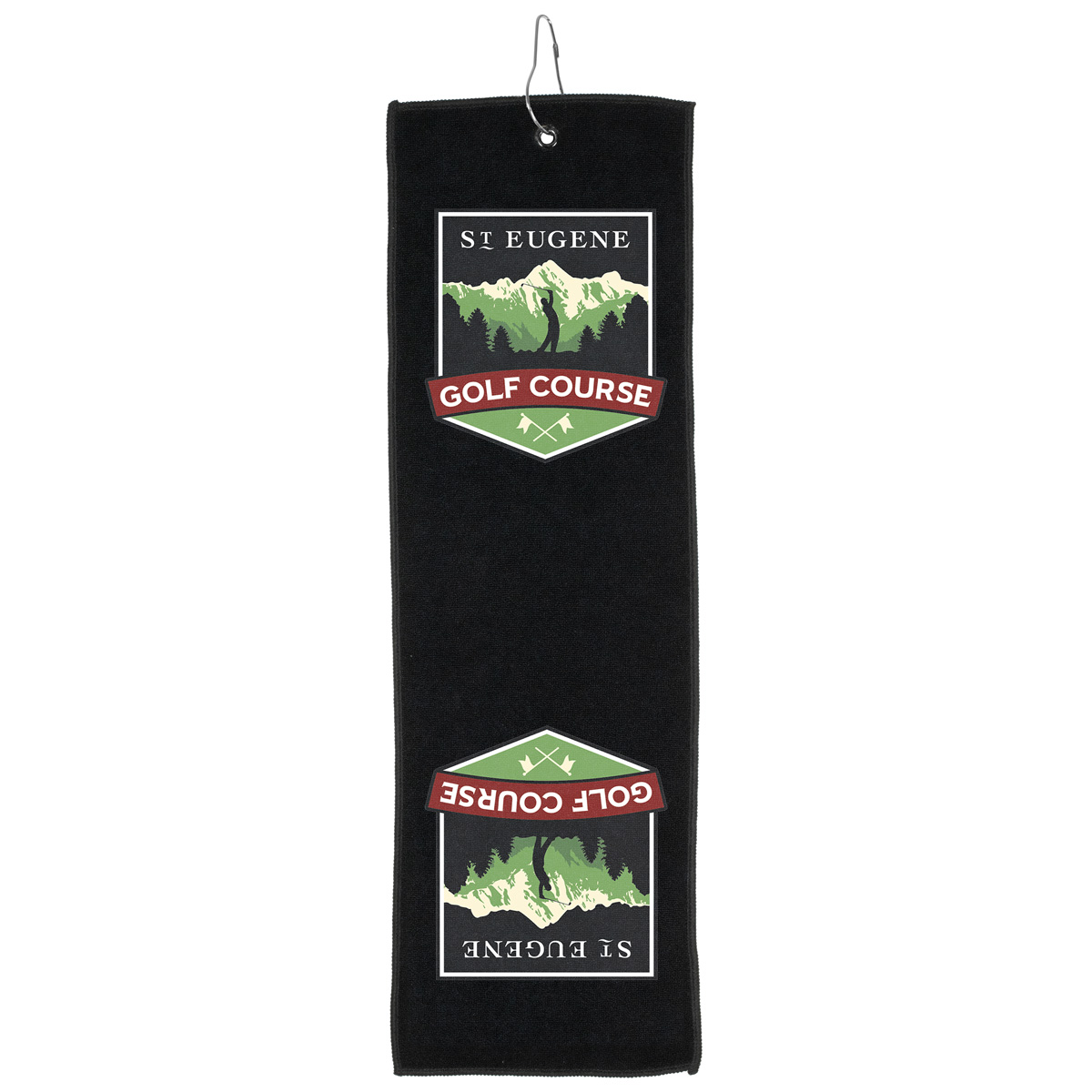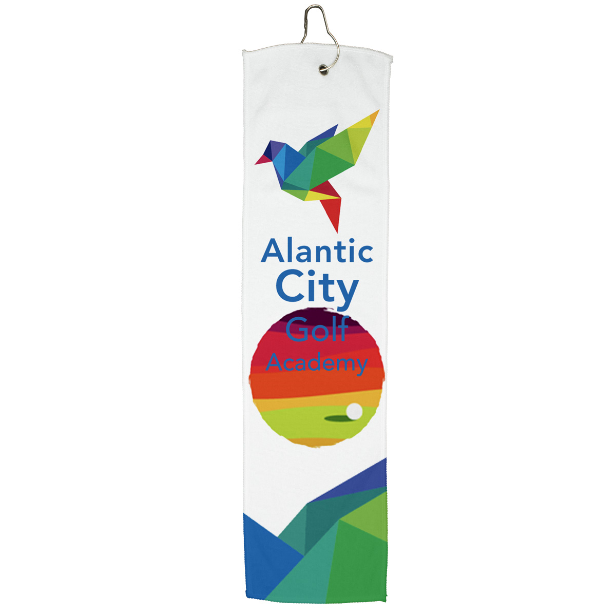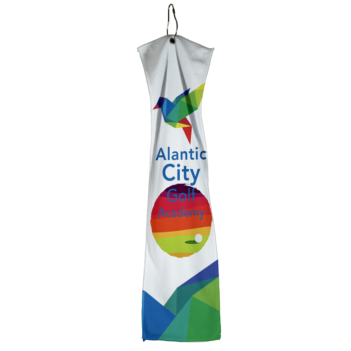 Our narrow, slim-cut recycled golf towel delivers powerful cleaning performance in a sleek, streamlined shape that hangs neatly from a golf bag. The elongated design gives golfers plenty of usable surface without the bulk of a traditional towel. It can even clip to a belt loop. Available with spot color (#5171) or full color imprints (#5171HT). Made from 300 GSM recycled polyester (RPET) material.