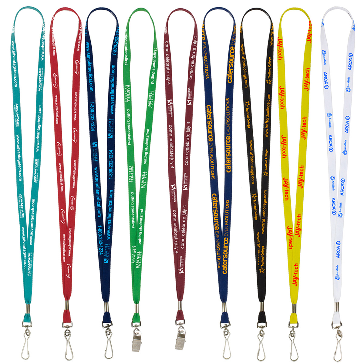 A 3/8” width polyester lanyard with a one color silkscreen imprint included in the price on the front (left and right side) of the lanyard. View Lanyard Attachments image for attachments included and optional as well. These lanyards are produced overseas.