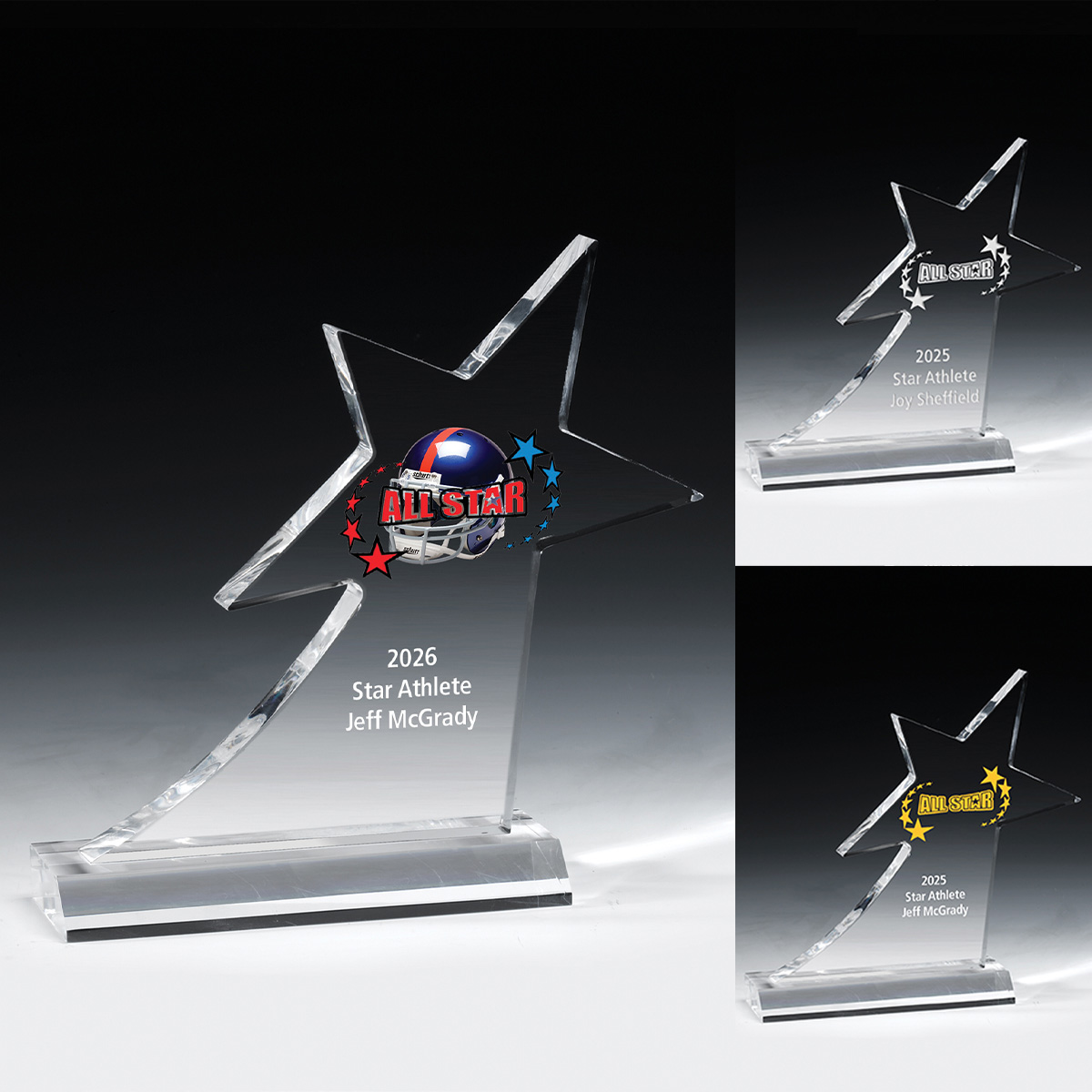 Acrylic Star Awards are a great way to recognize Star Achievers. They can be Screen Printed, Laser Engraved or 4 Color Process Printed.