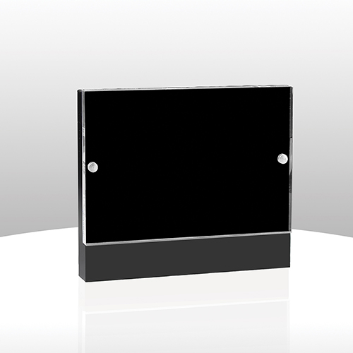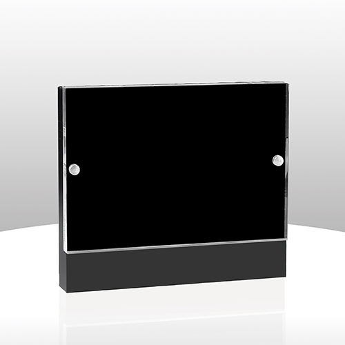 These acrylic frames are held together with small, but powerful, magnets. Your favorite pictures or inserts can easily be positioned inside for proud display. Choose from three popular sizes and include your Screen or laser engraved copy on the black base.