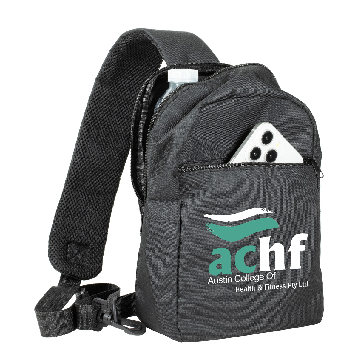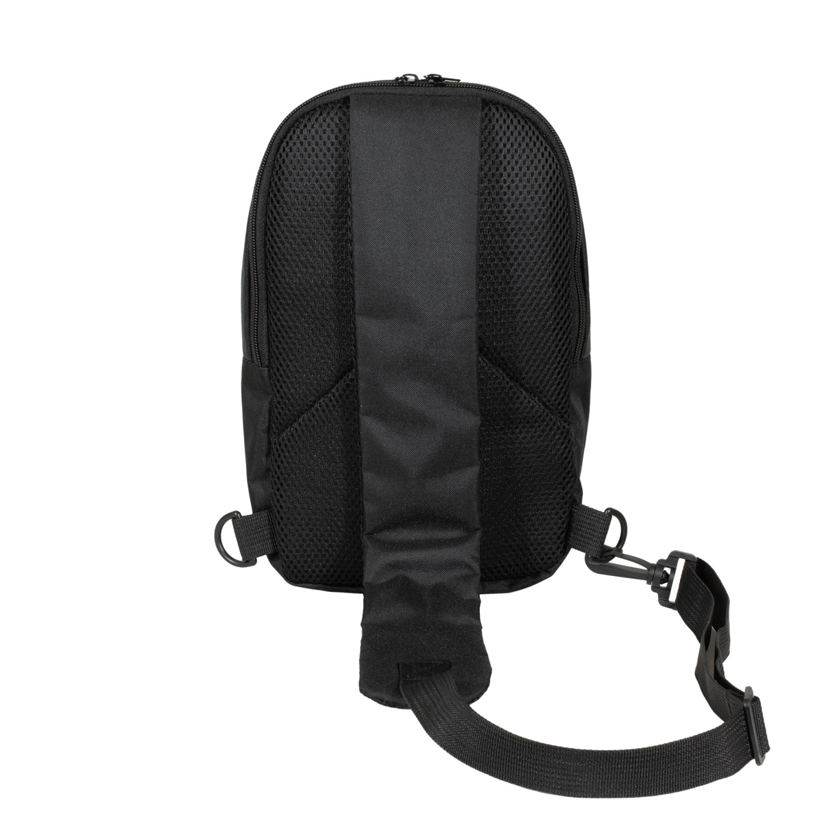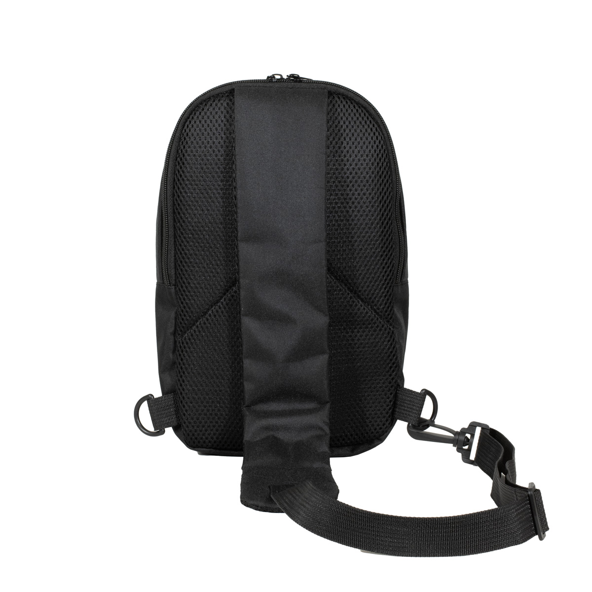 Built from rugged, eco-smart 300D RPET recycled polyester, this sling backpack bag looks good and travels light with a large main zippered compartment (11.5” H x 7" W x 3" D) and a quick access zippered front pocket (6 1/2" W x 9 3/4" H x 1/2" D). Heavily padded, breathable mesh strap and back panel keeps every carry cool and comfortable. Dual attachment rings allow you to wear on right or left shoulder.