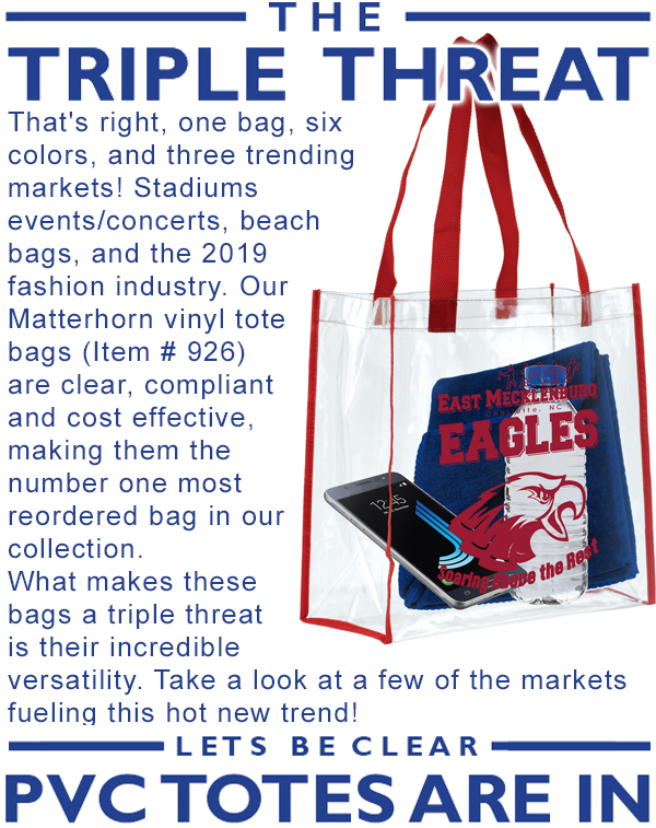 Clear PVC can be seen on catwalks around the world, and is still going strong in 2019. From Fendi to Chanel, transparent totes are the new "Luxe Must Have", take a moment and read the article below for the full story. With the fashion industry pushing the perceived value through the roof, these bags can go from Gift with Purchase to High End Trade Show Tote in a snap! |