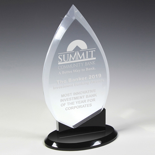 These 3/4” thick clear acrylic awards feature beveled edges and combine a clear message section resting on a black acrylic base. They can be screen or 4 color process printed or laser engraved.