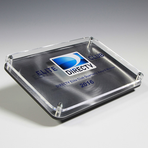 These innovative new awards include an acrylic layer with silver screws on top of a swirled metal base and are elevated on a slanted oval acrylic base. The floating acrylic can be screened or 4 color process printed or laser engraved.