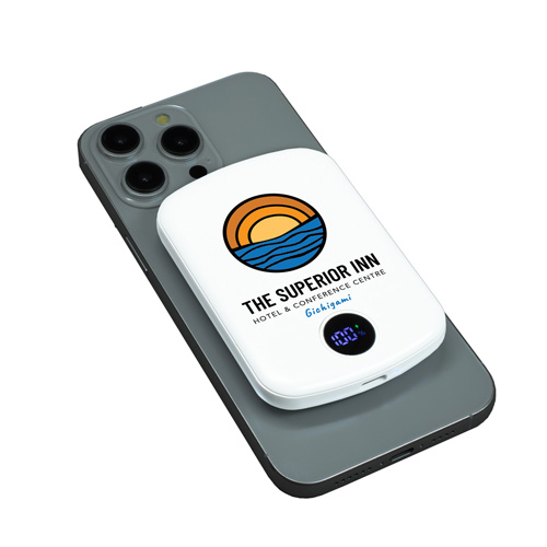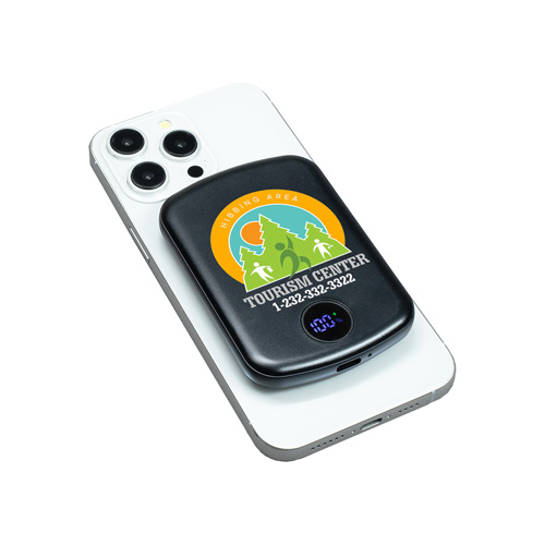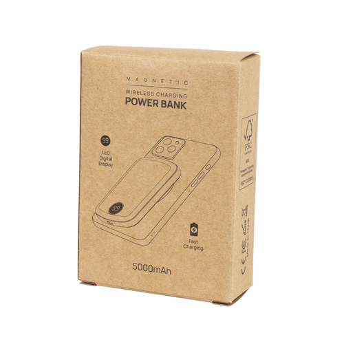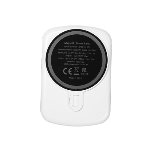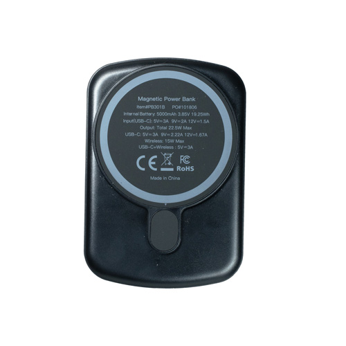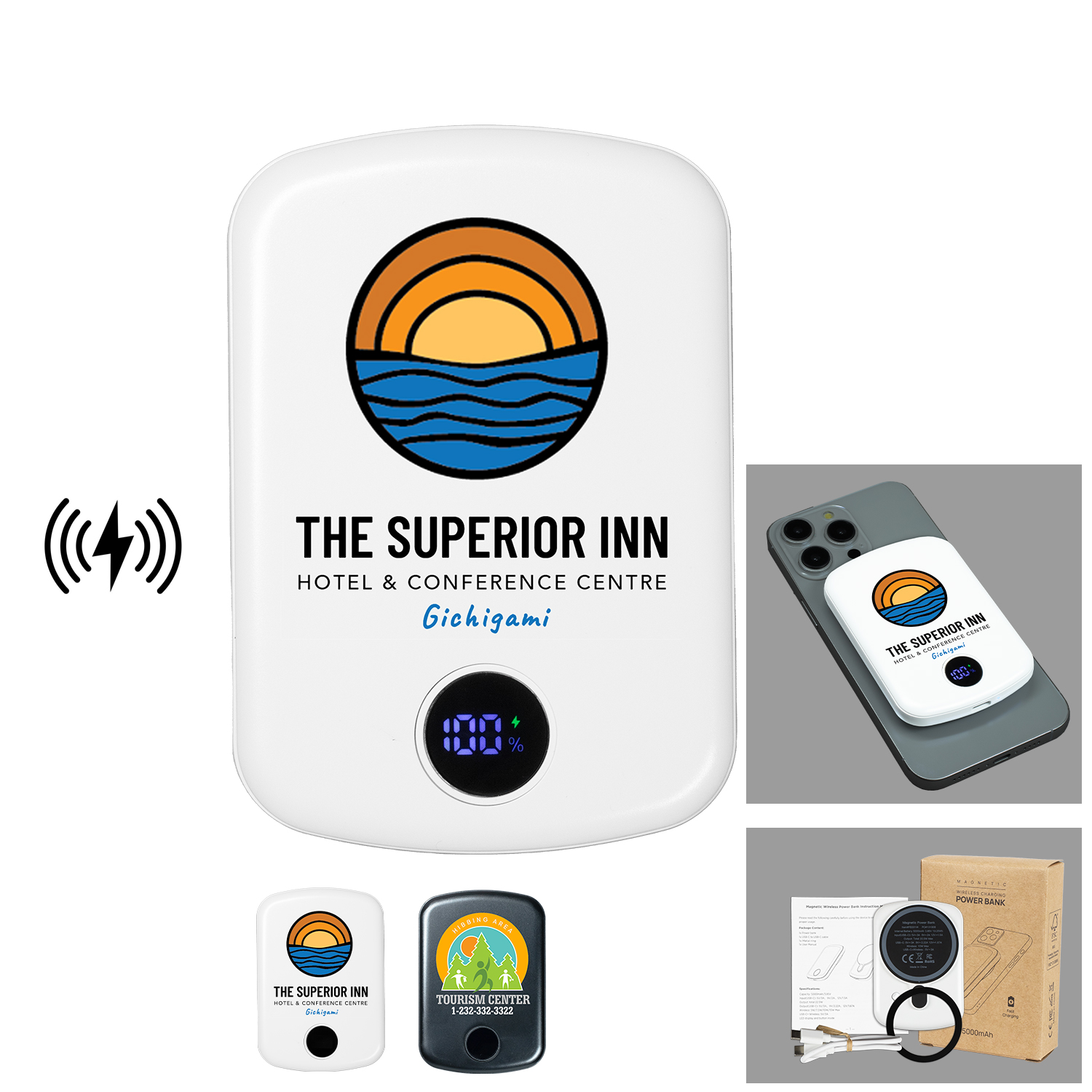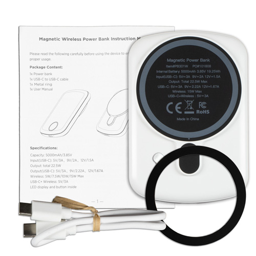 Magnetic Wirelss Charging Power Bank. 5,000 mAh UL Certified. Up to 22.5W Fast Charging Output. Upto 15W Wireless Charging Stay powered wherever life takes you. Slim portable design. Includes USB-C to USB-C charging cable, 1 metal ring and user manual. Eco-friendly packaging. Price includes: Up to full-color imprint on front side.