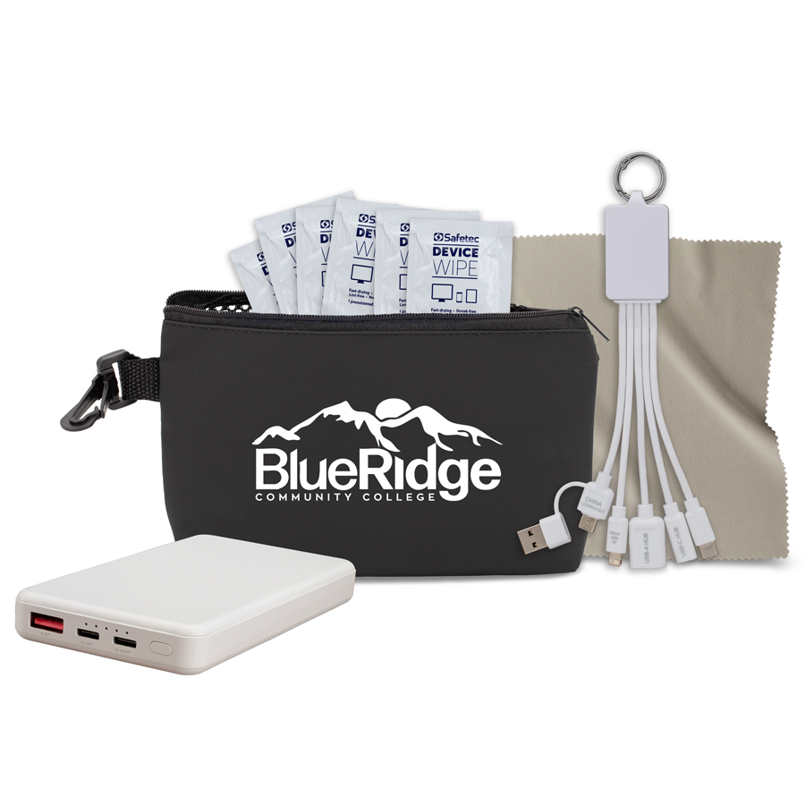 Tech Kit Includes: 4 Device Cleaning Wipes and the following unimprinted items: #5088 Grey 6” x 6” Microfiber, #PB300 10000 mAh Power Bank, #5164 Charging Cables w/2 Port USB Hub. Do not talk on phone while plugged into wall charger. IPhone® is a registered Trademark of Apple® Inc.