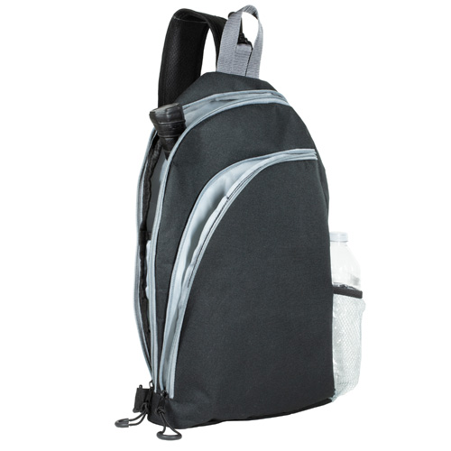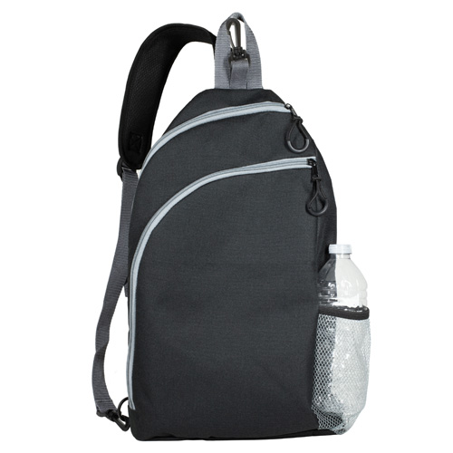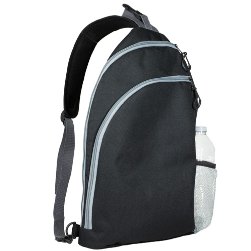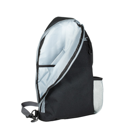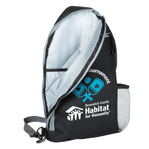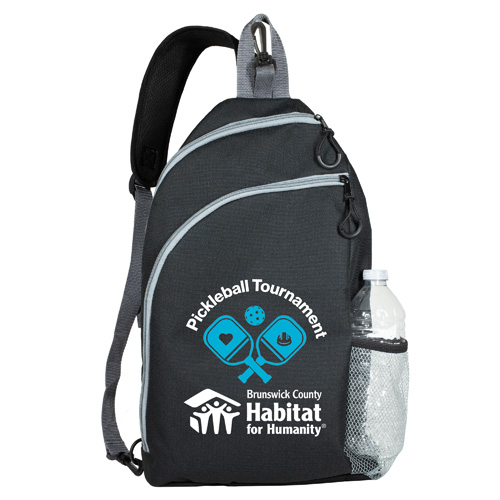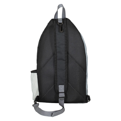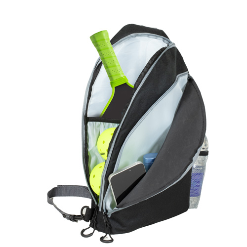 Crafted from durable 600D recycled polyester (RPET), this sports crossbody sling backpack bag is built with an oversized main compartment with an internal sleeve that holds up to two pickleball paddles, plus room for up to 20 pickleballs or other sports gear. The extra-large secondary zippered pocket can hold snacks, phones, wallets, keys, and other necessities. It also features a padded breathable mesh back panel and strap, padded bottom, bottom side loops for right or left shoulder carry, a mesh water bottle pocket, designer zipper pulls, a top carry loop, and built-in fence hook to make this an all-in-one courtside essential.