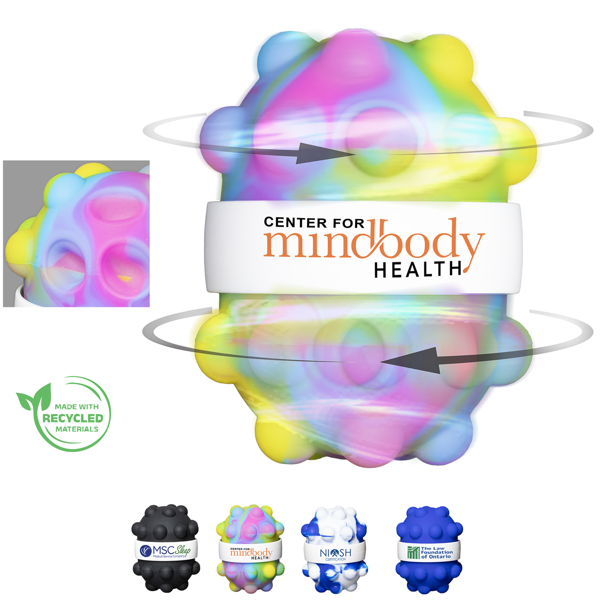Push, Pop, Spin - Repeat! Press the silicone bubbles and squeeze to hear and feel the satisfying POP! Then spin to your heart’s delight. Designed to ease stress, sharpen focus, and keep hands happily occupied. High-quality bearings ensure a quiet, smooth, and mesmerizing spin. Spin one or both sides - each side spins independently of the other. Made from Recycled ABS Plastic and Silicone.
