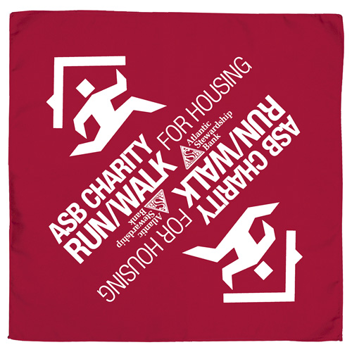 Easy to use, 22” x 22” all-purpose bandana accessory with extra-large billboard like imprint area that goes everywhere to promote your message. Use it as a neck scarf, headcover, headband, hair tie, flag, wall art and even as a face mask. Perfect for outdoor promotions for runners, walkers, hikers, cyclists, golfers and outdoor enthusiasts. Price includes a one-color imprint on one side. 100% polyester.
