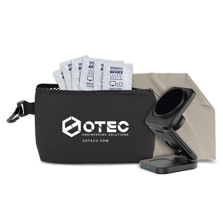 Tech Kit Includes: 6 Device Cleaning Wipes and the following unimprinted items: #5088 Grey 6”x6” Microfiber & #5166 3-in-1 15W Wireless Charging Station. Do not talk on phone while plugged into wall charger. IPhone® is a registered Trademark of Apple® Inc.